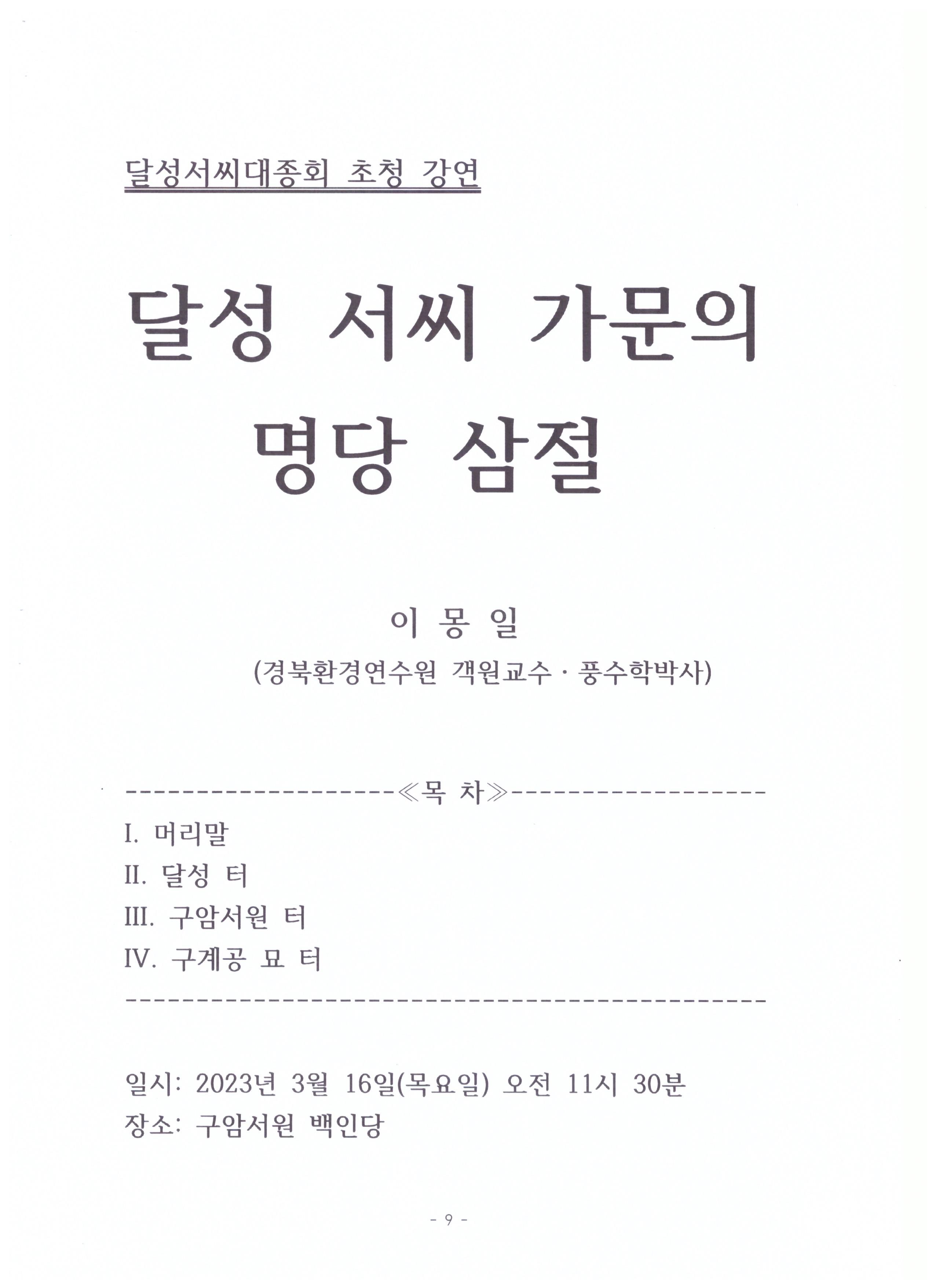 "달성서씨 가문의 명당 삼절" 이란 제목으로 강연하신 내용입니다.